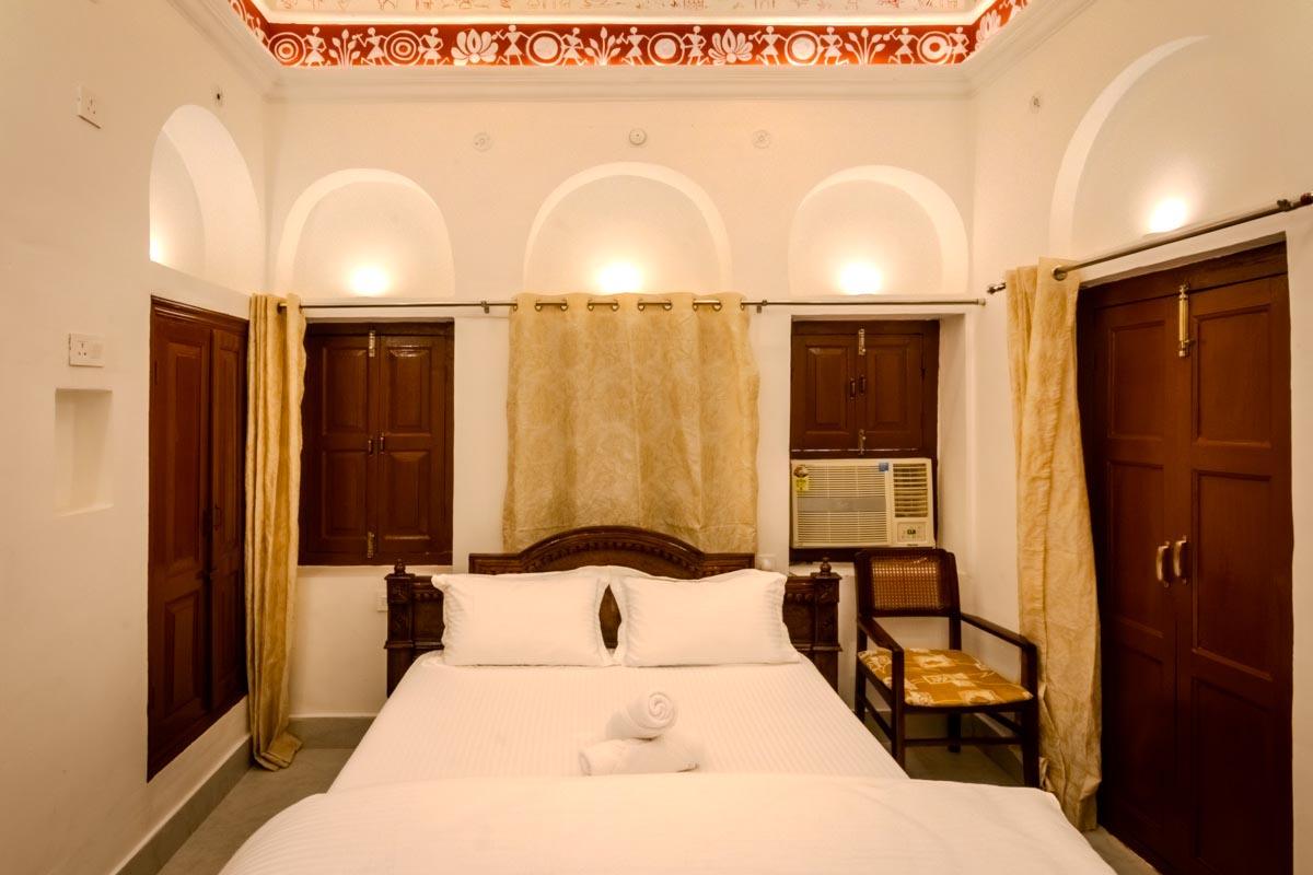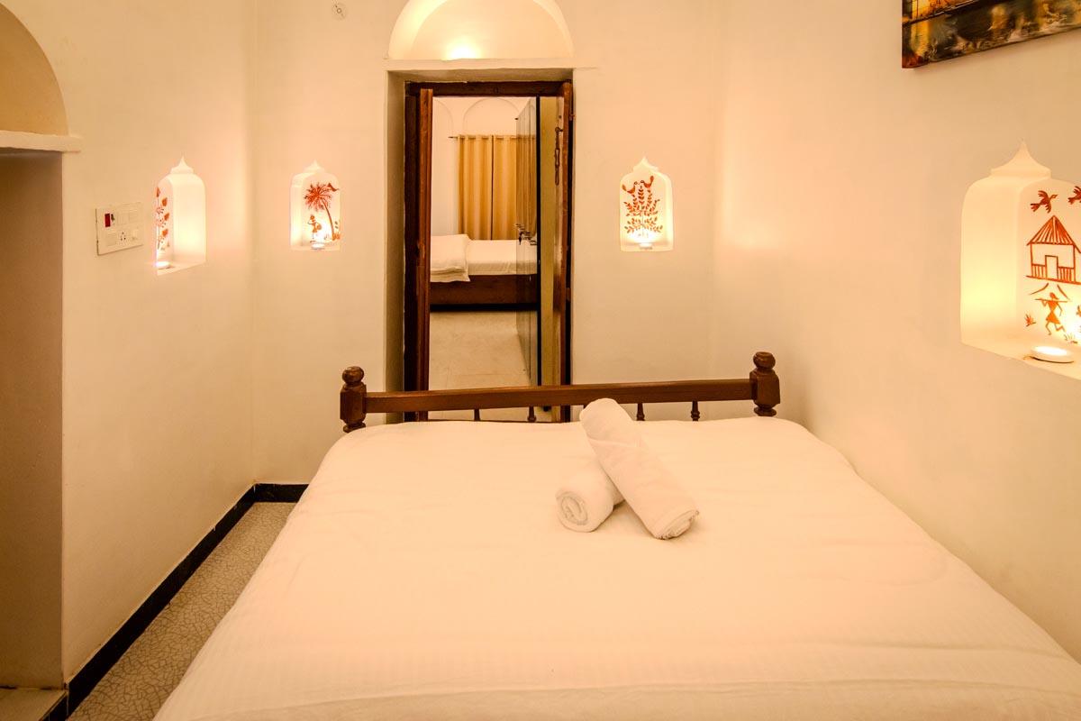 A peaceful first-floor room with a king-size bed and a private (detached) bathroom. It offers a view of the temple path from the window and opens out to the inner haveli courtyard – a serene space to relax and reflect.