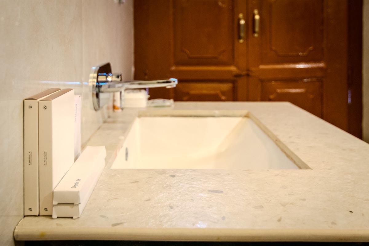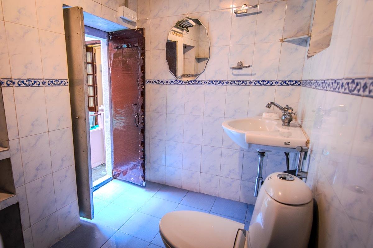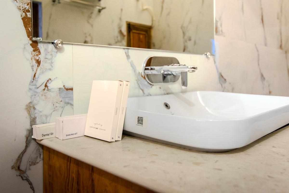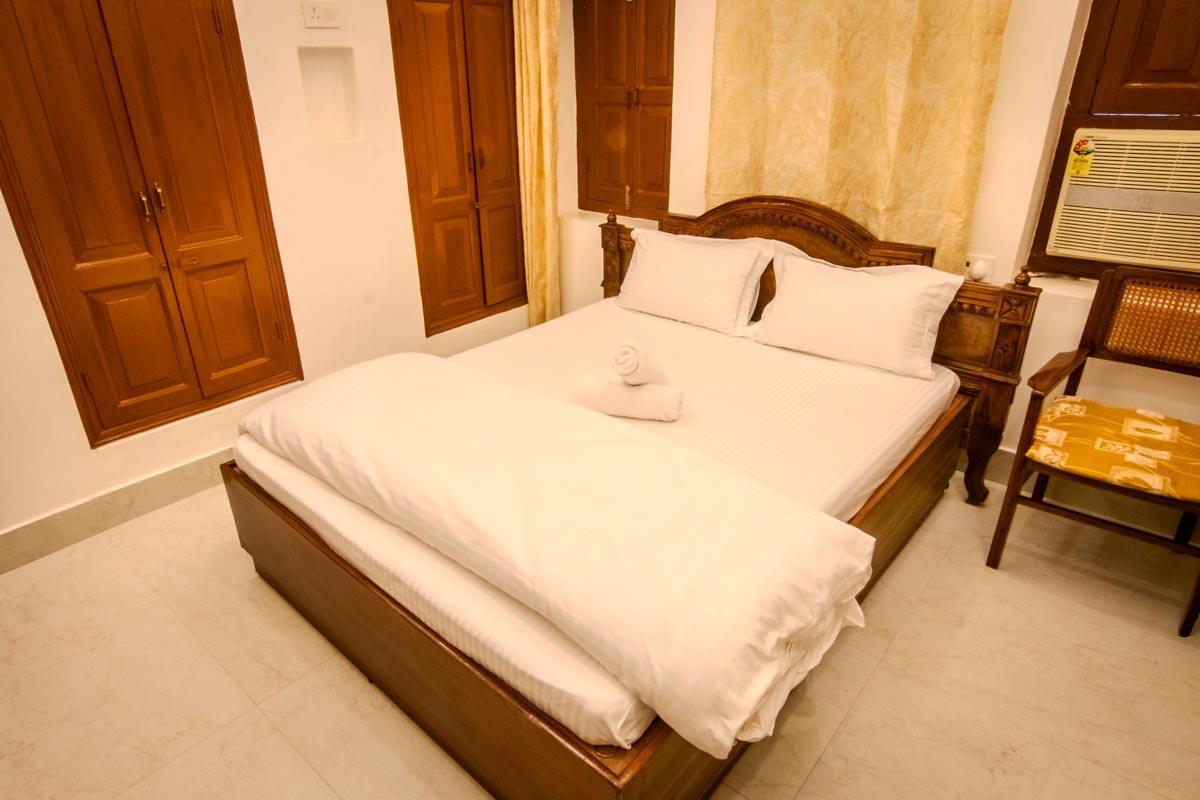This expansive suite on the first floor includes two interconnected rooms and an attached bathroom. The inner room opens to a private balcony with a rare view of the Shiva temple inside the haveli, as well as the street leading to Kashi Vishwanath Temple.